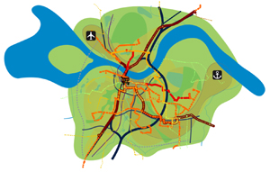 • Der skal sikres høj tilgængelighed mellem midtbyen og regionale og internationale forbindelser: Universitetet, Universitetshospitalet, Østhavnen og lufthavnen.