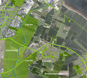 De interne forbindelser er koblet op mod de store rekreative værdier ved Romdrup Ådal, skov og krat på bakkeøen og Limfjorden.