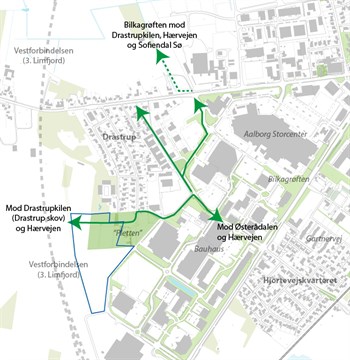 Illustrationen viser byudviklingsplanens principper, i form af vigtige sammenhænge, der skal tages i betragtning i den mere detaljerede planlægning af områdets fremtid.
