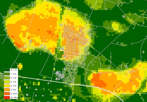 I områder med en årlig oversvømmelsesrisiko på 5 % eller derover, som vist på kortet til højre, er det vigtigt enten at undgå fremtidig bebyggelse eller i forbindelse med planlægning at indrette området, så oversvømmelse kan undgås, eksempelvis ved at indrette områder til afledning af regnvand i form af en regnvandssø i et rekreativt område.
